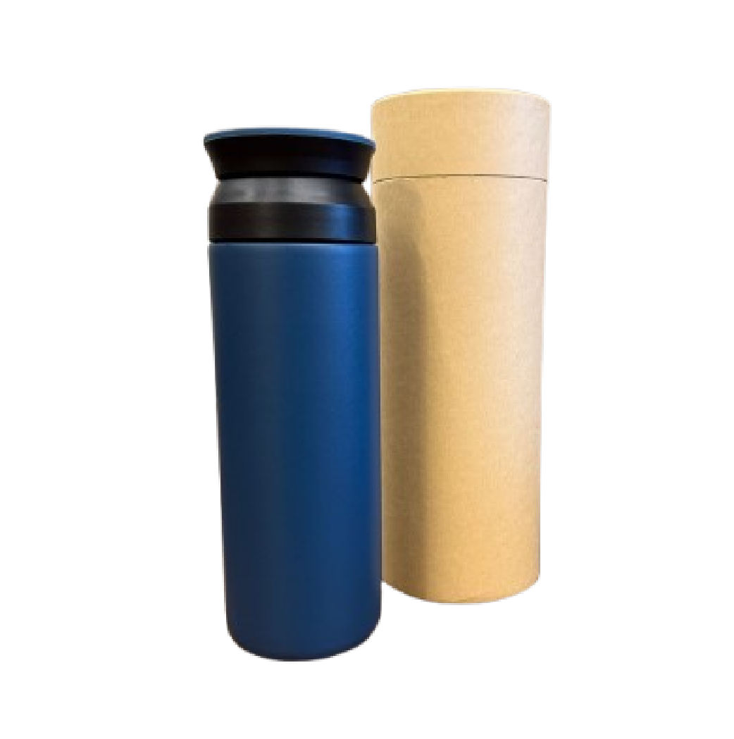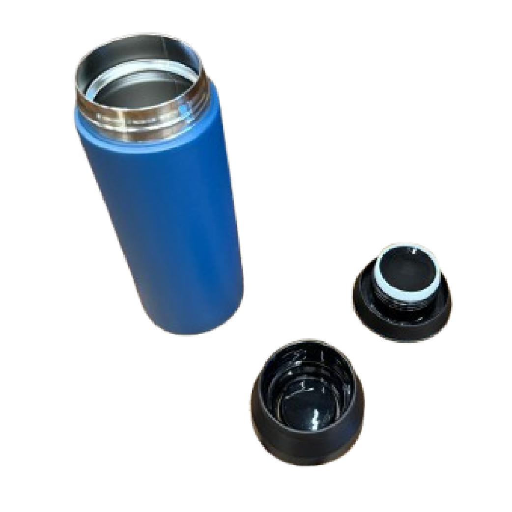 Acero inoxidable de doble pared de 500 ml .Peso: 244 g. Altura: 21 cm. Diámetro base 6.8 cm. Diámetro tope 5.6 cm, doble tapa con filtro, base antideslizante y empaque cilíndrico.