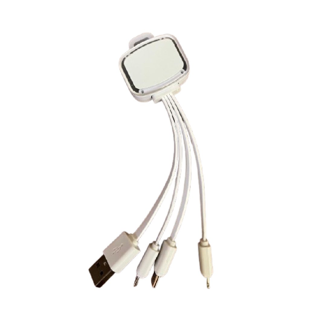 Material: PVC. Medidas: 22.5cm. Cable cargador para celulares. Incluye: 3 conectores Iphone. Puerto C, Android, USB.