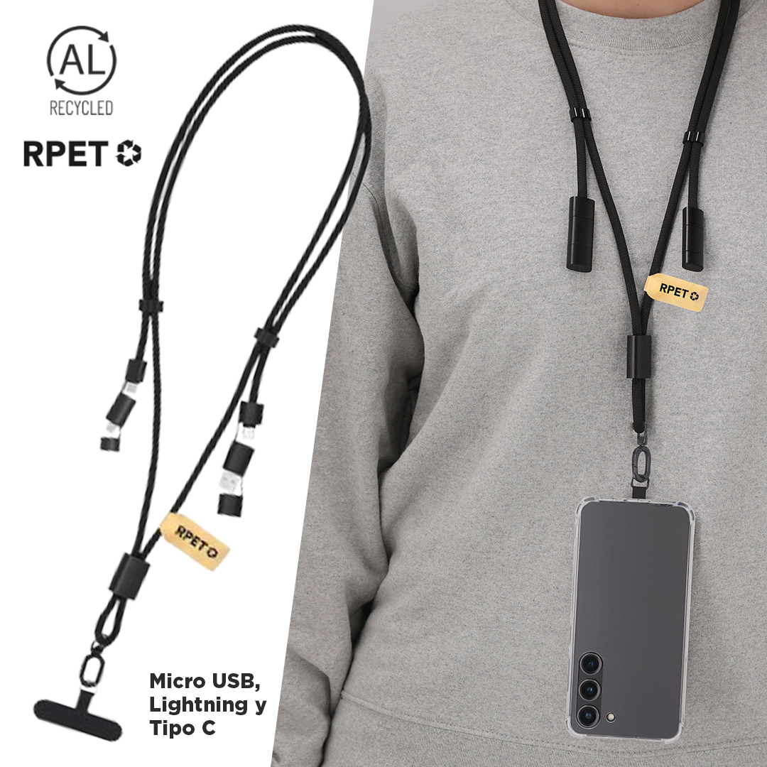 Cable cargador con anilla fabricado en caña de trigo, para así fomentar la utilización de materias primas naturales y reducir las emisiones contaminantes. Incluye conexiones de entrada Tipo C y USB; salidas Lightning, Micro USB y USB. Presentado en bolsa individual de diseño kraft. Conexión Micro USB, Tipo C y Lightning 5V DC 2.4A