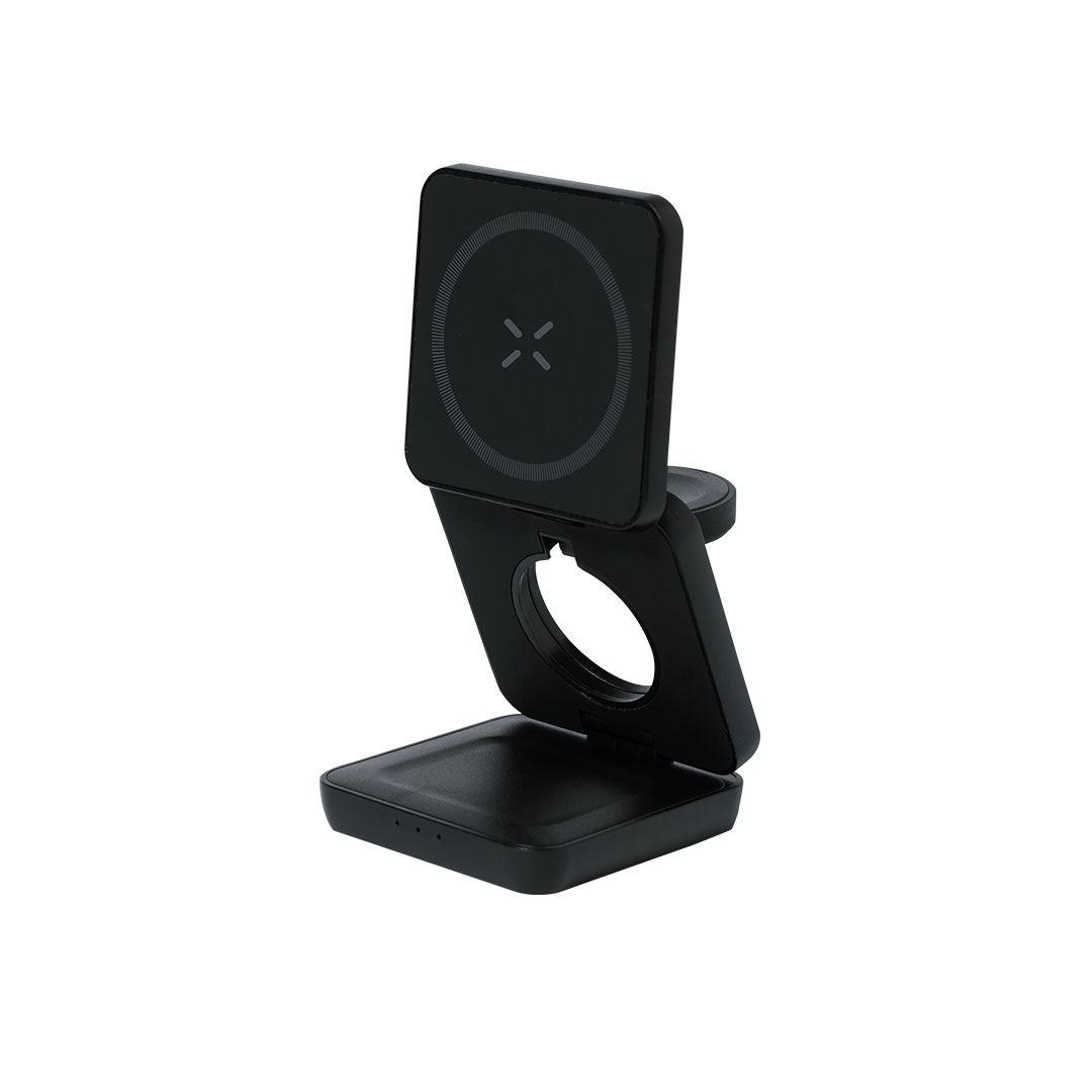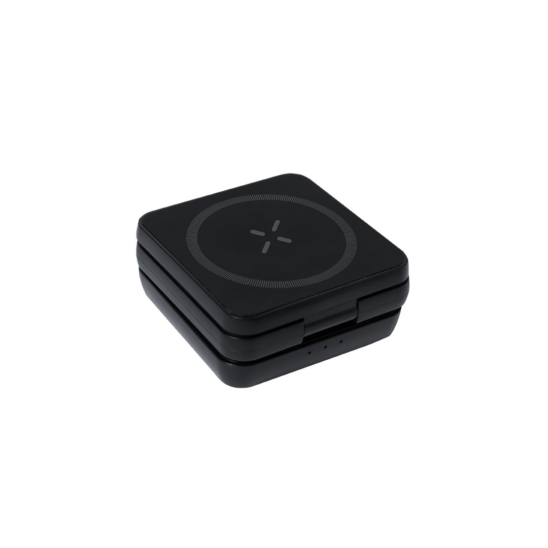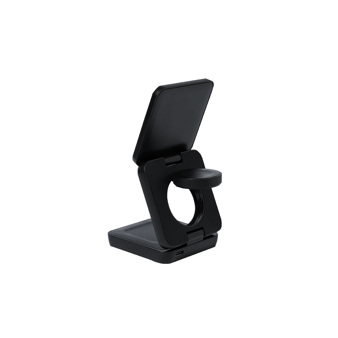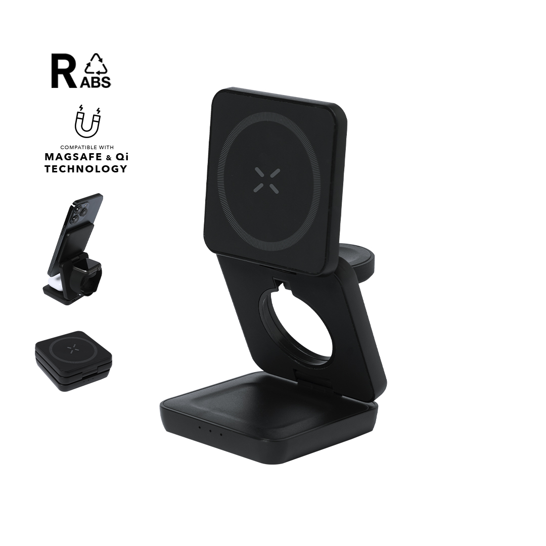 Cargador inalámbrico magnético 4 en 1 de 15W, fabricado en ABS reciclado (RABS). Diseñado para la carga simultánea del smartphone, auriculares, smartwatch y soporte. Un gadget todo en uno: plegable, portátil, de tamaño compacto, muy versátil y de diseño funcional. De acabado mate con tacto gomoso. Conexión por usb Tipo C -cable incluido-.El RABS es un plástico altamente reciclable de gran resistencia y con multitud de aplicaciones que lo convierten en una solución eco-friendly. Fabricado conforme a los estándares RoHS y en cumplimiento con los siguientes requisitos de seguridad:Sistema de protección contra sobrecalentamiento.Sistema de protección contra sobrecarga.Sistema de bloqueo para evitar cortocircuitos. Inalámbrico 15W. Magnético. Plegable