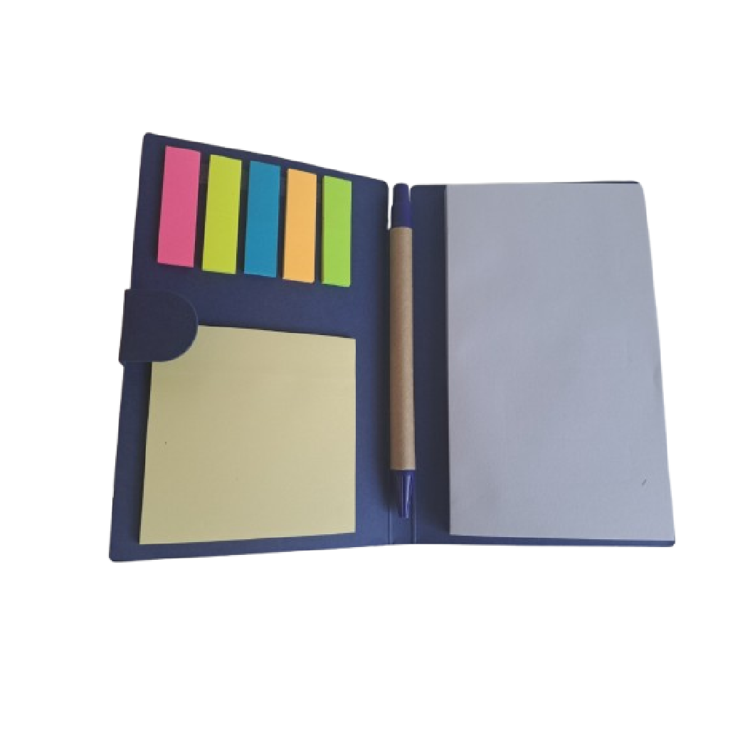 Descripción: Libreta ecológica que contiene 6 tacos post it de diferentes colores, 70 hojas blancas y un lapicero ecológico.