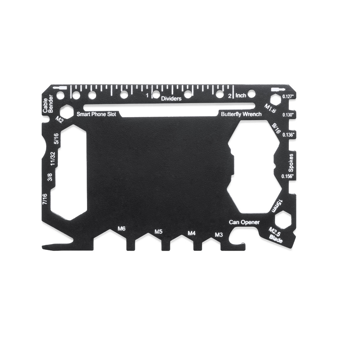 Multiherramienta con resistente cuerpo en acero inox y 17 funciones. Entre otras, funciones abrelatas, cuchillo, destornillador, regla, abrebotellas, llave inglesa, llave de mariposa y transportador de ángulos. 17 Funciones. Funda Polipiel