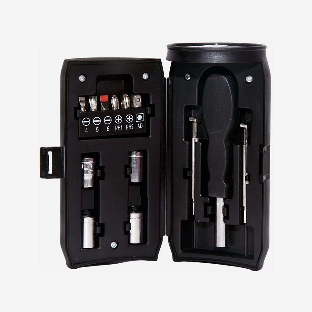 Material: PVC. Medidas cerrado: 16.0 x 16.0 x 5.0 cm. Medidas abierto 32.0 x 16.0 cm. Incluye: (24 piezas). 1 Alicate Mango de desarmador, 1 Vástago o caña de desarmador, 10 Puntas adaptadores para desarmador, 5 Dados hexagonales para desarmador3 (Medidas) Llave Allen exagonal2 desarmadores delgados 1 con punta estrella y 1 con punta plana1 Wincha.
