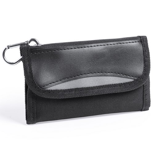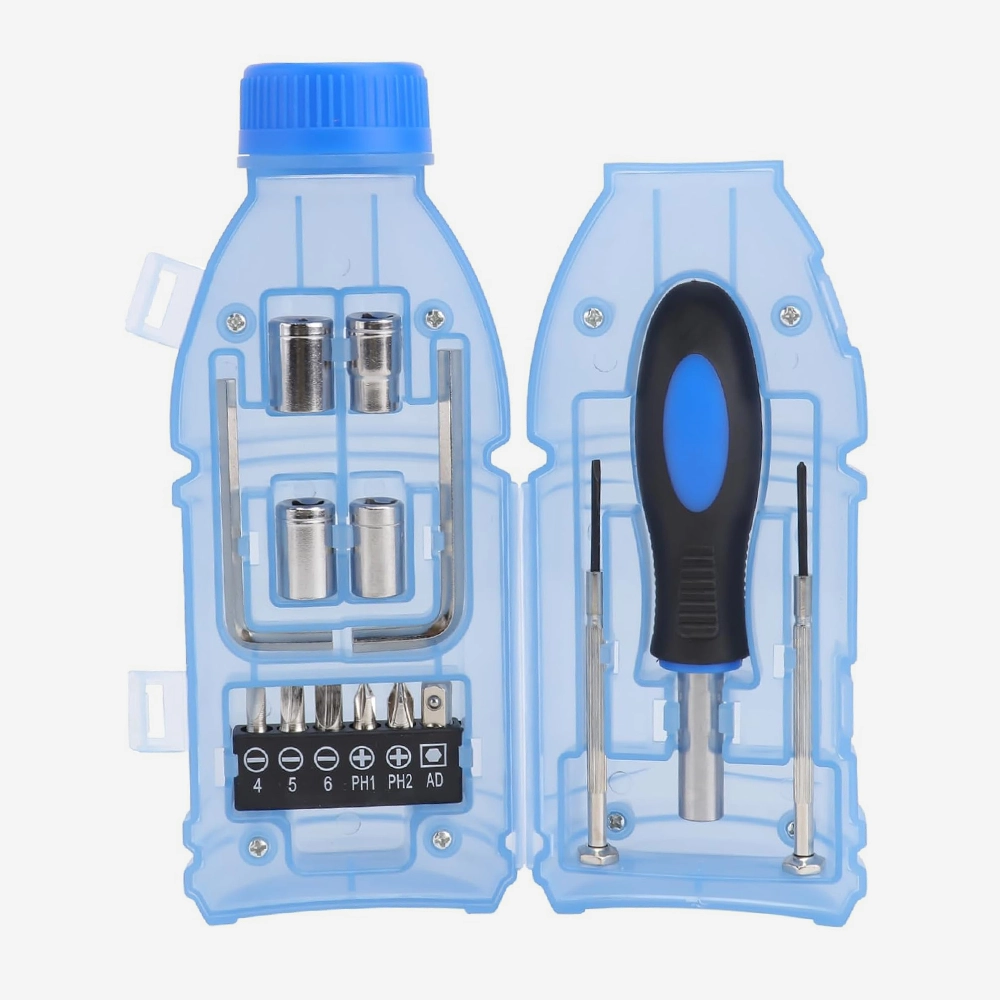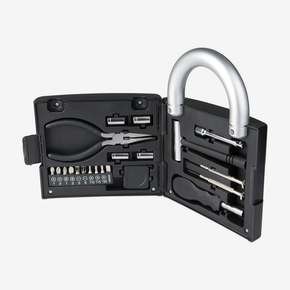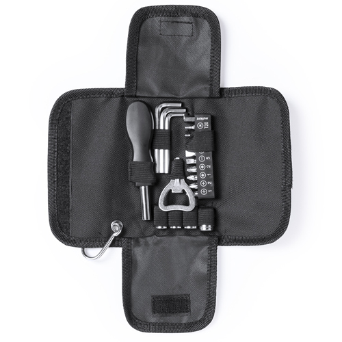 Set de herramientas de 19 accesorios en resistente estuche de poliéster con cierre de cremallera. Incluye herramienta de fijación, cabezales destornilladores planos, de estrella y tipo torx, set de llaves tipo allen, llaves para tuercas de cabeza hexagonal y destapador. Con mosquetón metálico de transporte.