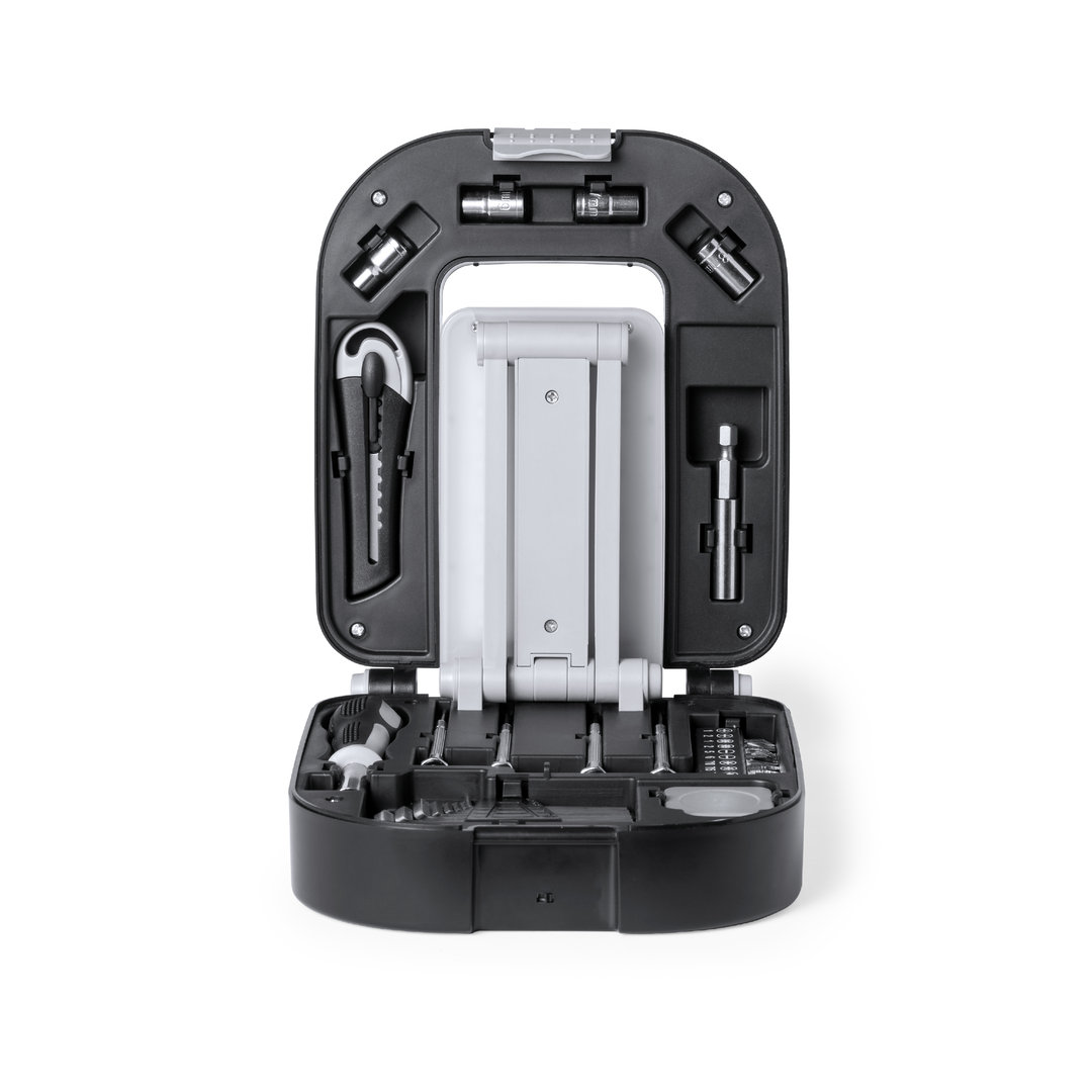 Original set de herramientas con luz y 30 accesorios. Presentado en resistente caja de ABS negra con cierre. Lámpara plegable integrada la caja, con 24 LEDs y botón ON/OFF. Incluye destornillador con multitud de puntas planas, philips, torx… Con kit de destornilladores de precisión; llaves de tubo y llaves allen en distintas medidas; cutter y flexómetro 1m. Lampará con alimentación a pilas (3xAA no incluidas). Presentado en caja individual de diseño kraft. 24 Ledes. Intensidad de Luz Regulable. 30 Accesorios. 3 Pilas AA No Incluidas
