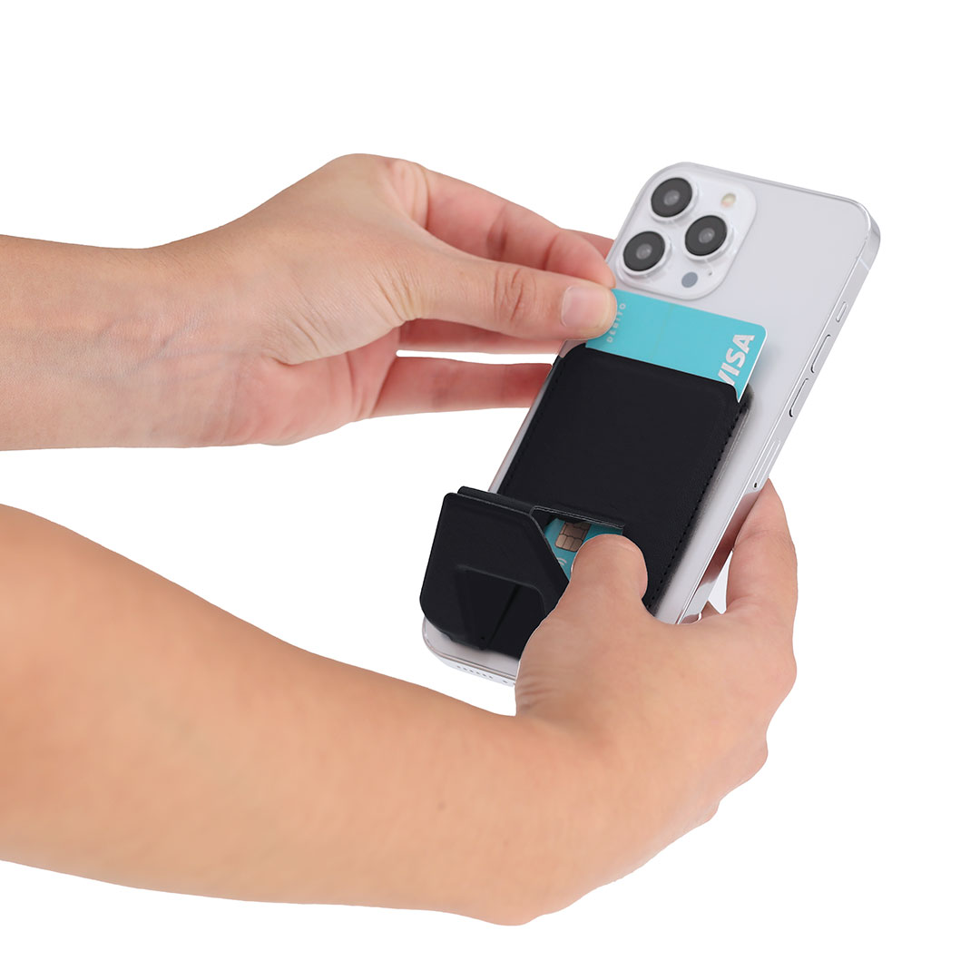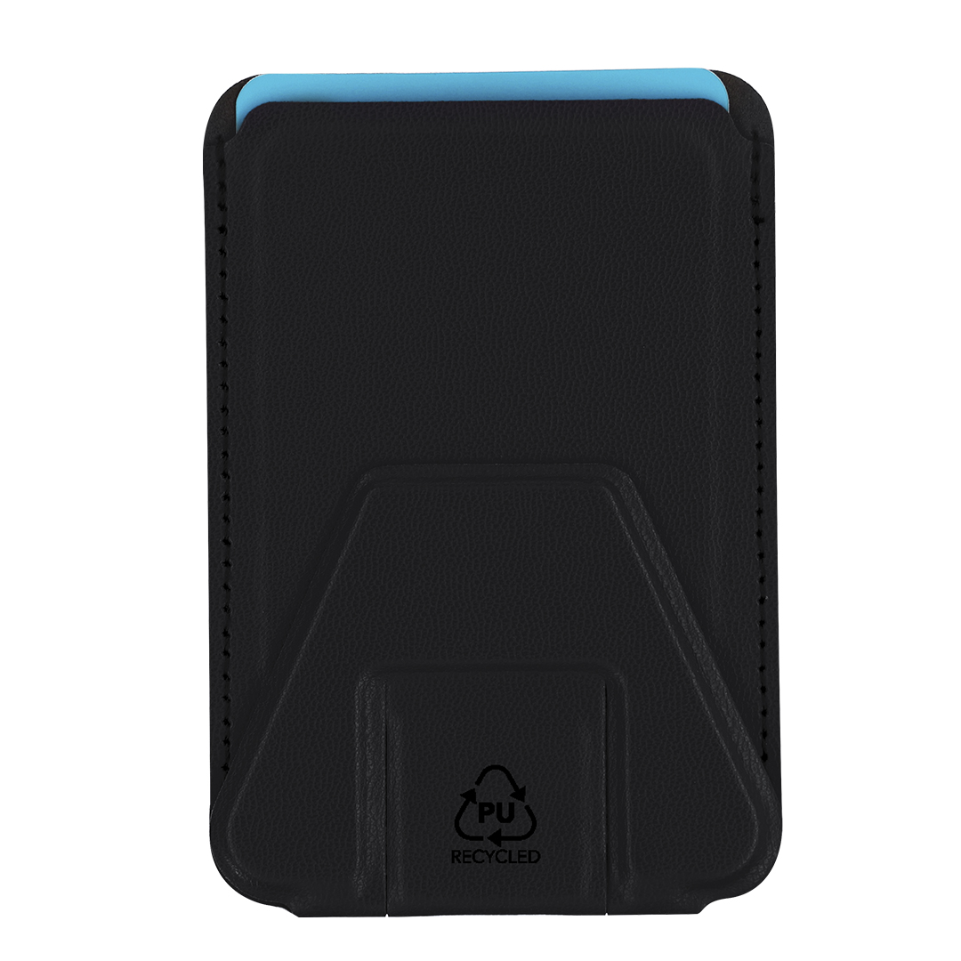 Funda tarjetero en PU Reciclado. Con soporte multifuncional que permite diversas posiciones. Con sistema de fijación adhesiva. Incluye distintivo PU reciclado.La PU Reciclado destaca por su resistencia y elasticidad. Este material reciclado y reciclable es una opción sostenible que rescata las fibras desechadas en los procesos de fabricación, minimizando así el desperdicio de material y contribuyendo a su vez a reducir el impacto ambiental, manteniendo a la vez sus propiedades originales. Adhesivo